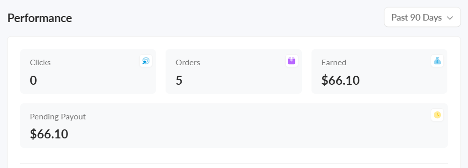 The Affiliate Portal will give your affiliates secure access to their own Affiliate Dashboard where they can see performance stats based on the selected time range; specifically, clicks, orders, earned commissions, and pending payout.