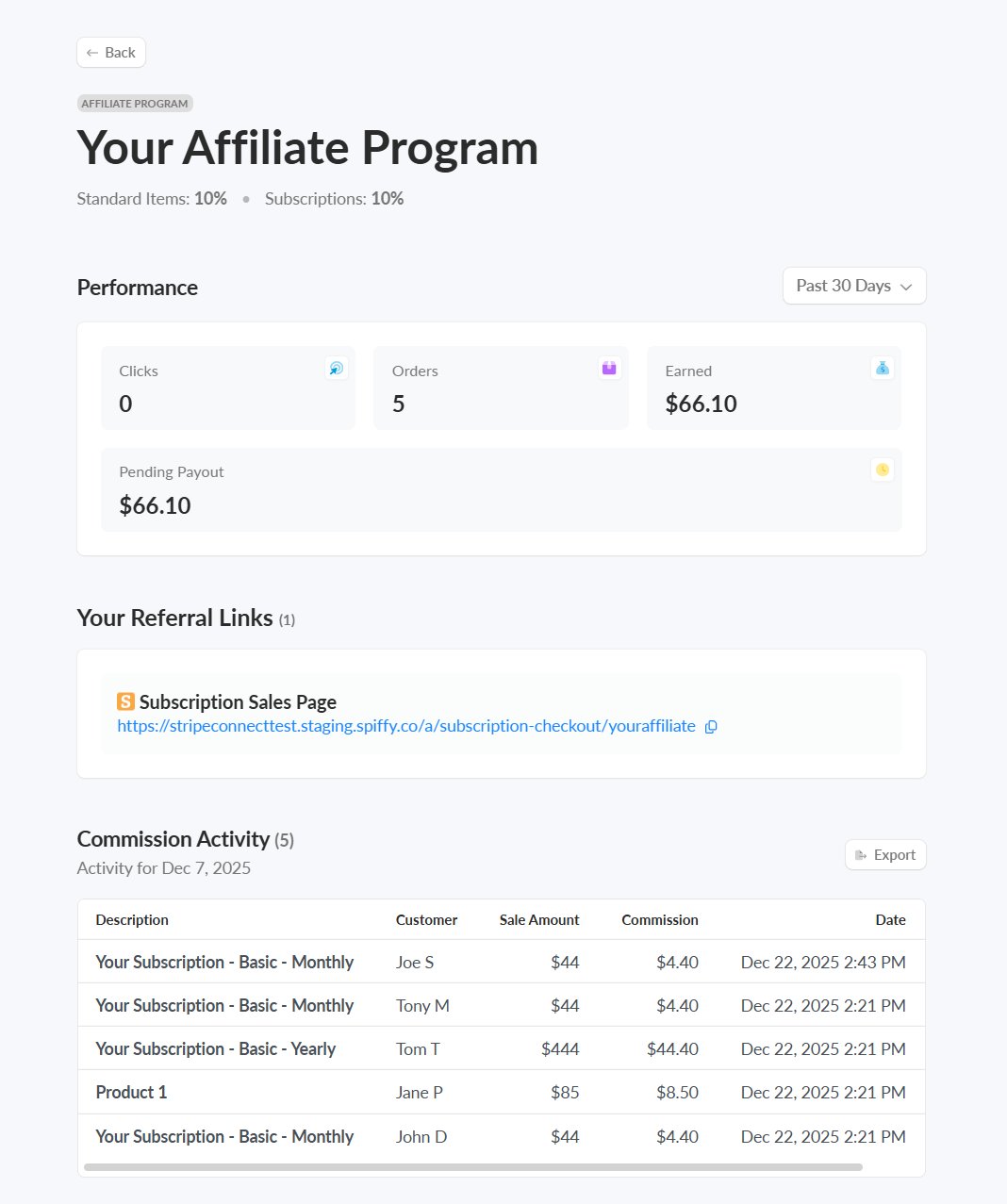 Your Spiffy Affiliate Portal is where your affiliates can view their stats and programs, and access to their unique tracking links to share and earn commissions.